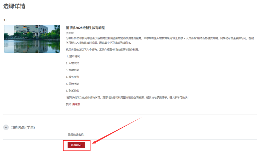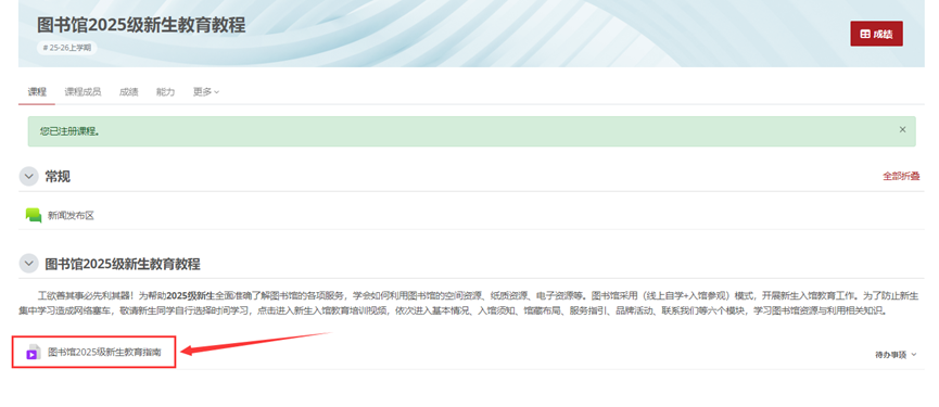 (二)选择“图书馆2025级新生教育教程”,然后点击“继续”。